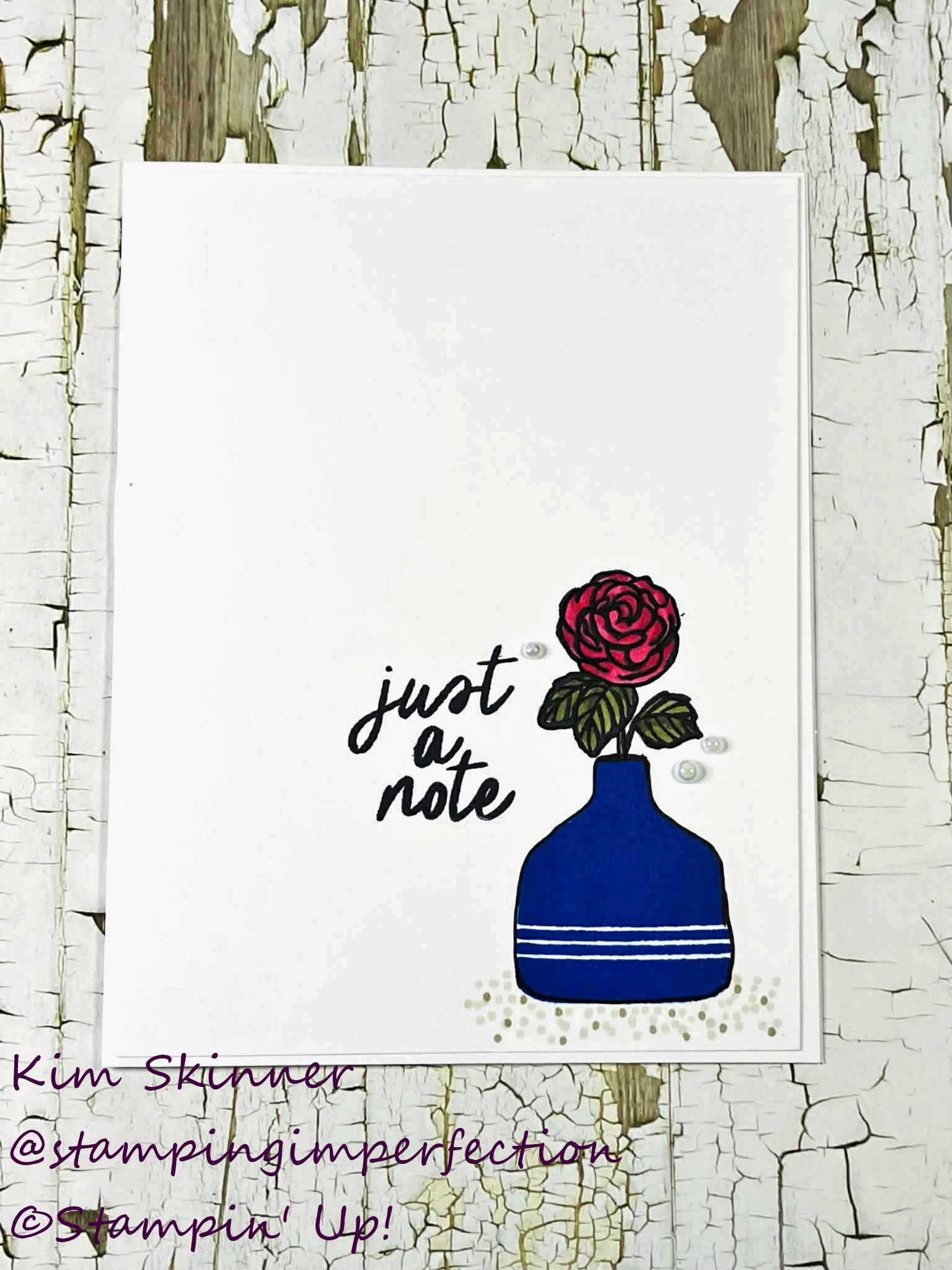 I stamped the vase in Blueberry Bushel then used a black journaling pen around the outer edge to define the image. I stamped the flower in black by masking off the vase, so the flower appears to be inside the vase. It’s actually a very long stemmed rose!