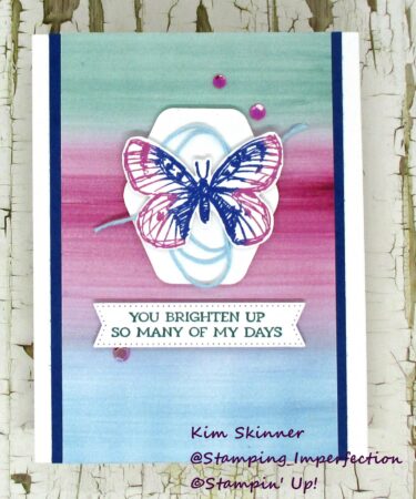I liked the layout of the card, but I didn’t love all the white layers. I also wasn’t happy with the colors I used on the butterfly. I added Blueberry Bushel as a mat behind the DSP and as a banner piece behind my focal image and sentiment. I used the Nested Layer Dies and the Stylish Shapes dies for some of these cards. I also used the Modern Oval Punch and the Heartfelt Hexagon Punch on the cards.