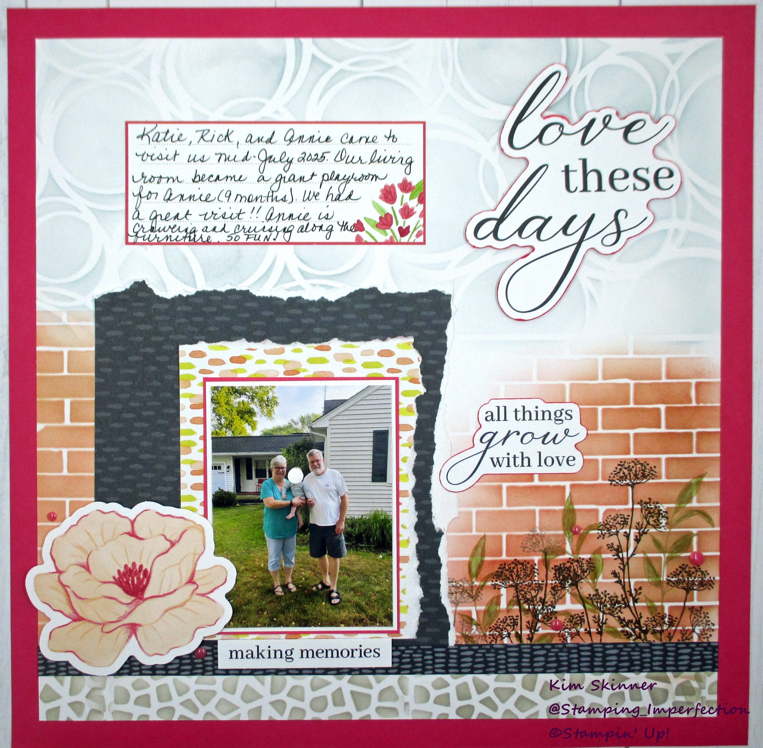 My final detail was to add some of the new In Color embellishments in that Strawberry Slush color. My base page is actually of a color from Close To My Heart that is very close to Strawberry Slush. I’m trying to use up my older paper from CTMH so I can justify spending money on the gorgeous colors that Stampin’ Up! has. (Of course I want all the things!)